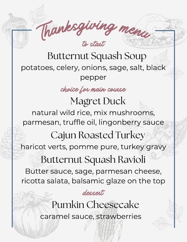 Our signature dishes are crafted to highlight the best of the season. From the perfectly roasted turkey to the indulgent pumpkin pie, each bite is a celebration of tradition and taste.